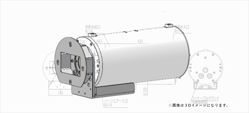 - 高温環境下でカメラを保護するために、2重構造の筐体に冷却用の水を流しハウジング内部を冷却します。
